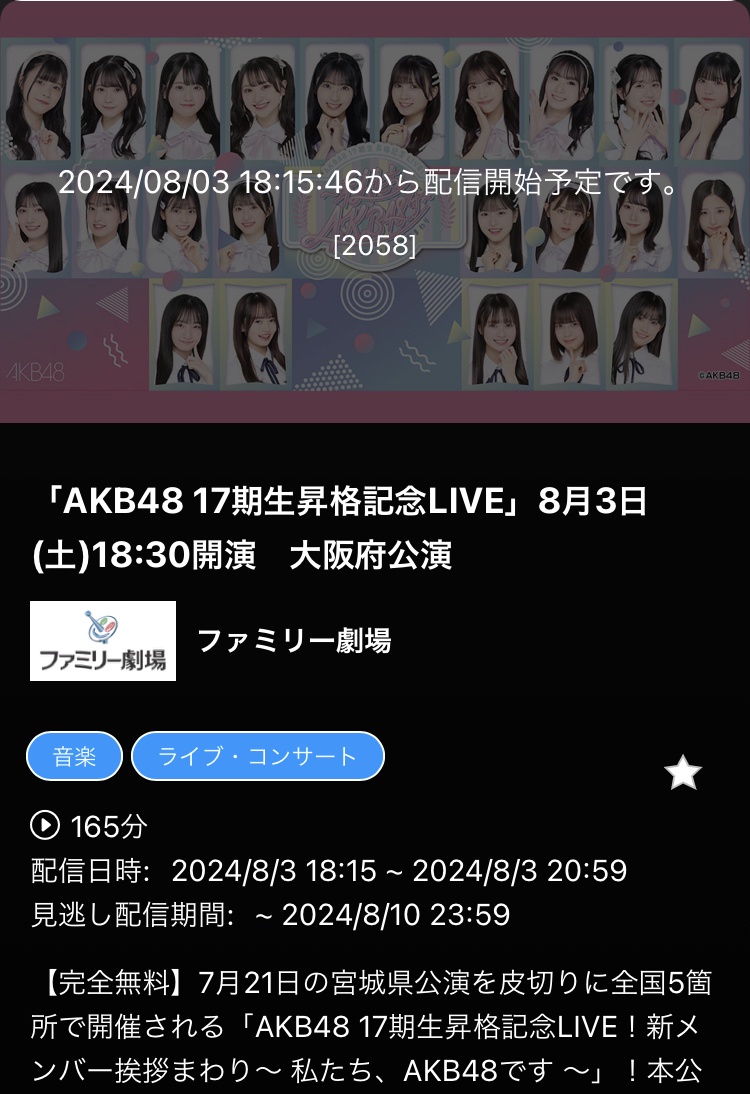 本公演のうち計5公演を、最長寿となるAKB48冠バラエティ「AKB48 ネ申テレビ シーズン42」を絶賛放送中のファミリー劇場の提供により、『スカパー!番組配信』