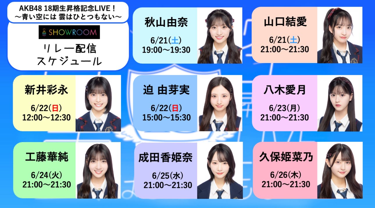 「AKB48 18期生昇格記念LIVE!~青い空には 雲はひとつもない~」全4公演のSHOWROOMプレミアムライブでの生配信が決定いたしました!