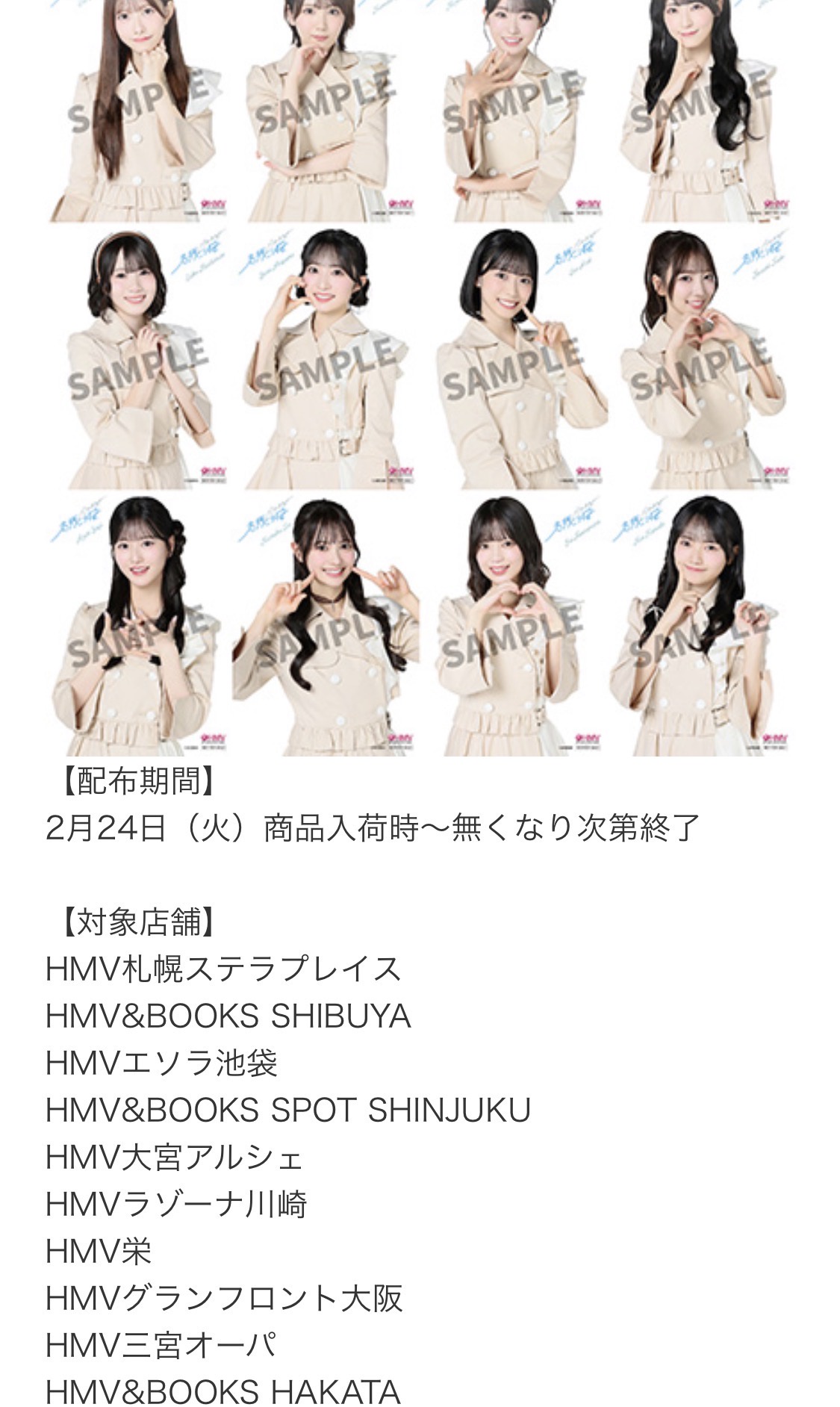 対象店舗にて直接ご購入いただいたお客様に限定のHMVコラボブロマイド(16種よりランダム1種)をプレゼント(一部メンバー直筆サイン入り)