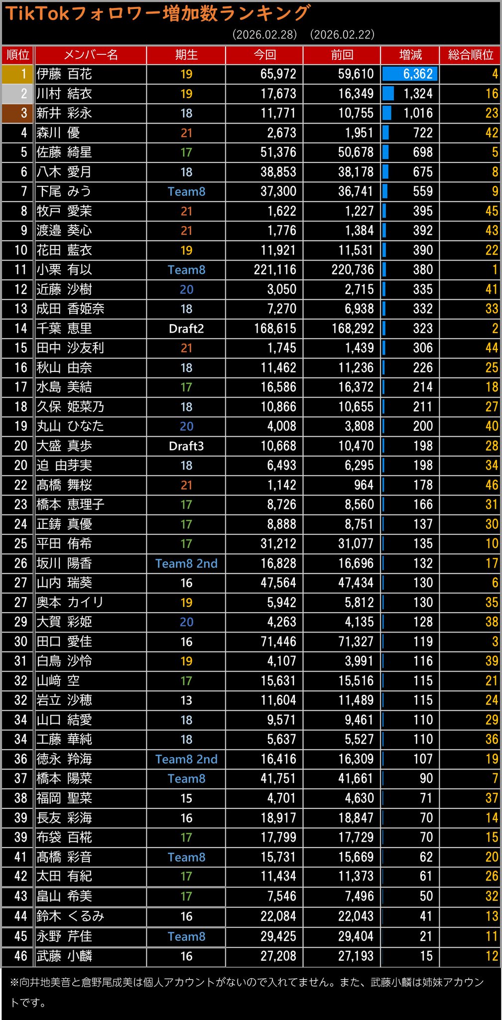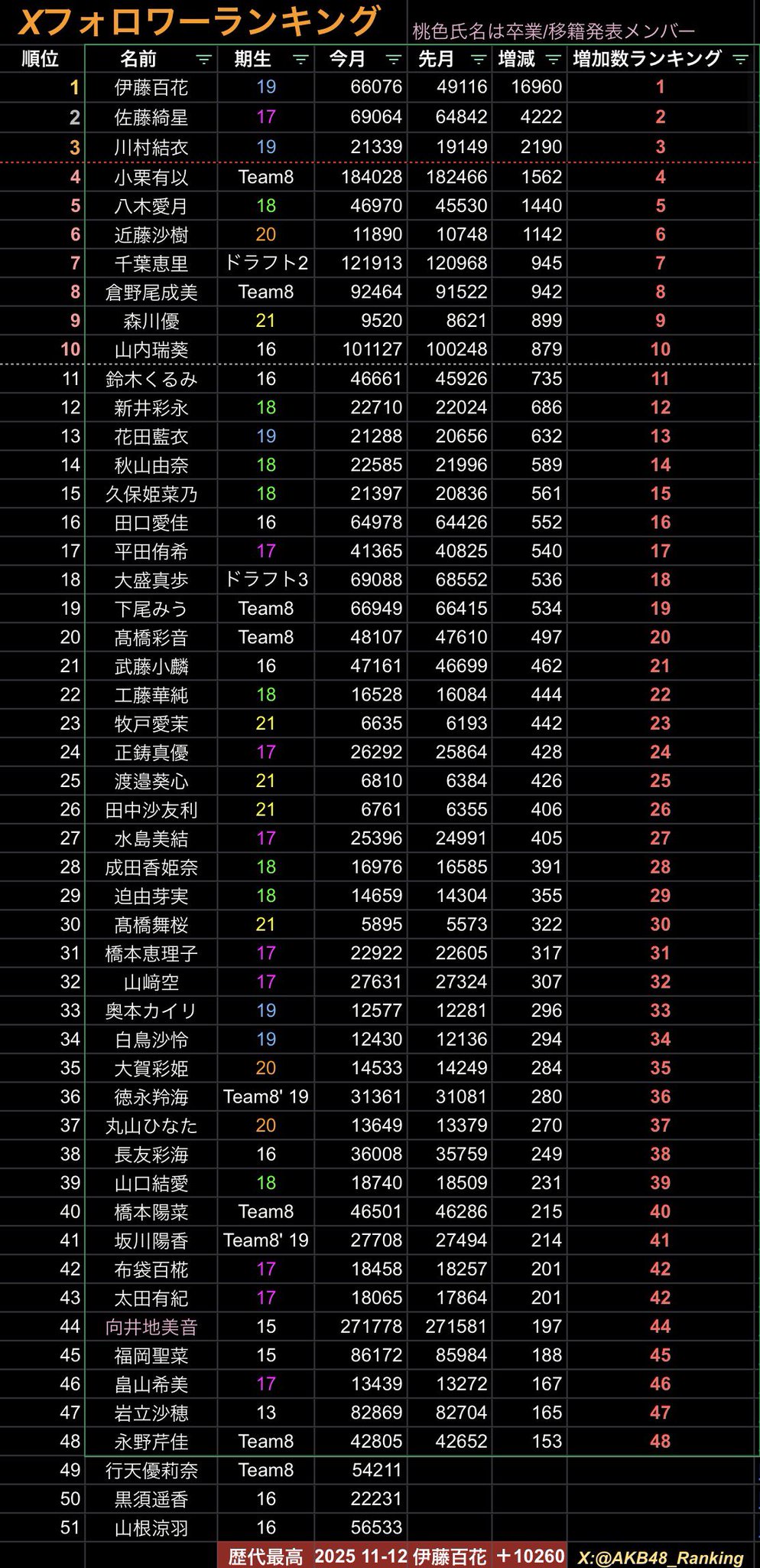 ⭐ 伊藤百花が歴代最高の増加数(伊藤百花 +10260)を更新
