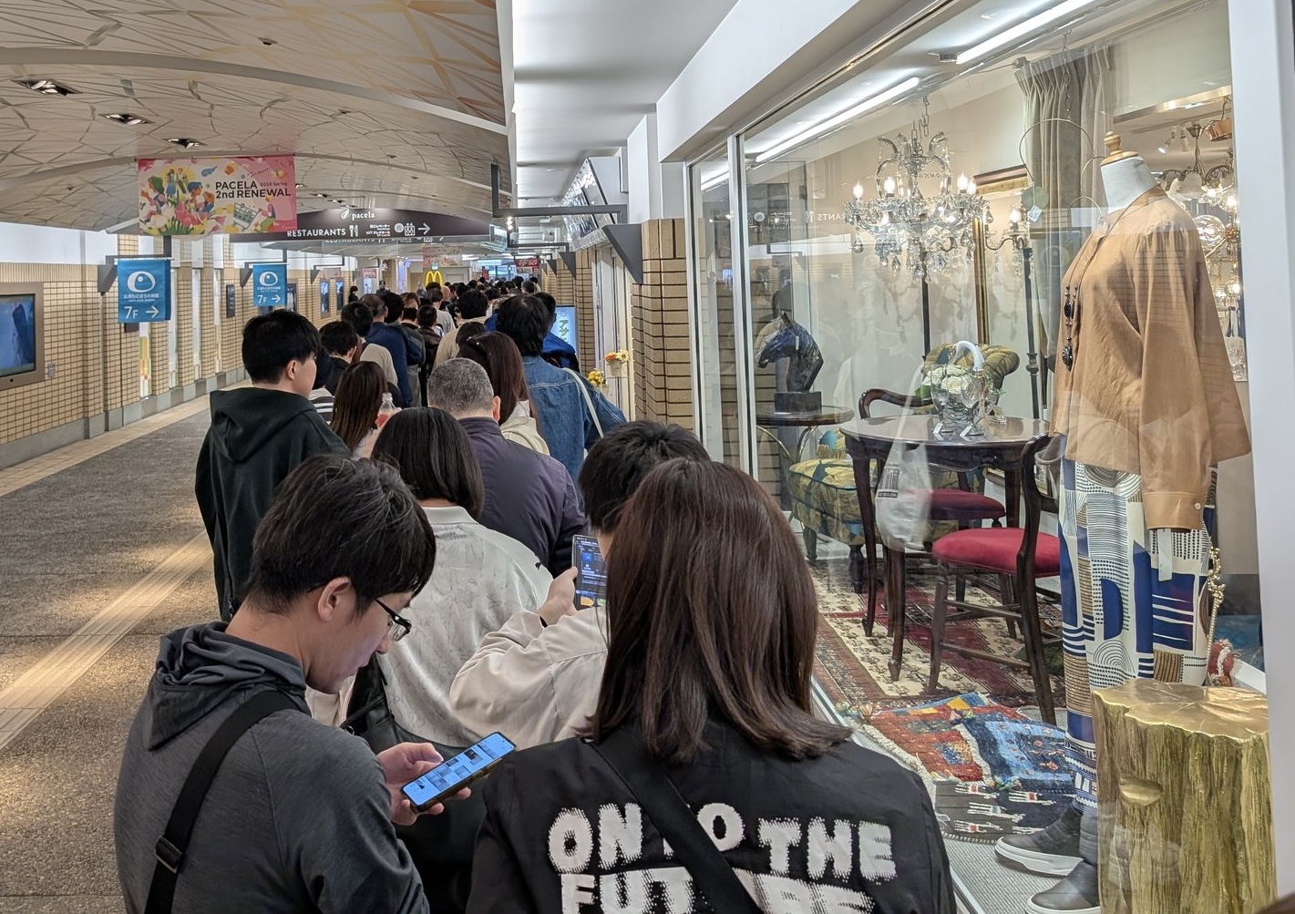 クレドホールの地下で入場列に並んでいるが、たぶんこのままじゃ13時15分に開演までに入れないかも。